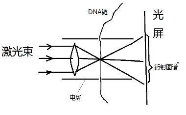 測序流程:合成一段已知序列的單鏈DNA,要求含有全部A G C T四種核苷酸。在脈沖電場作用下,這段已知序列的帶負電的DNA單鏈被拉直并一堿基一堿基的通過納米孔,每通過一個堿基便會出現數微秒的停頓。低能超細高頻激光束經過聚焦,在焦點處與剛剛經過納米孔的DNA單鏈相遇,經過衍射,在另一側的光屏上形成衍射圖譜,由于DNA單鏈的間續性運動,會產生間續性衍射圖譜,以衍射圖譜與DNA序列作對比,可以得出每種圖譜對應的堿基。
